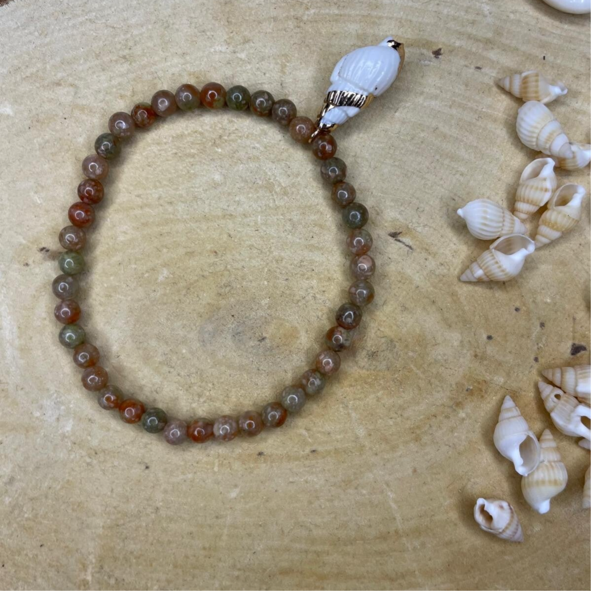 Unakiet heeft een warme, aardse uitstraling en helpt je om in je eigen tempo te groeien en te helen. De gedraaide schelp hanger voegt een vleugje oceaanenergie toe: rustgevend, intuïtief en verbonden met de natuur. Samen vormen ze een harmonieuze armband die kracht en zachtheid meedraagt.