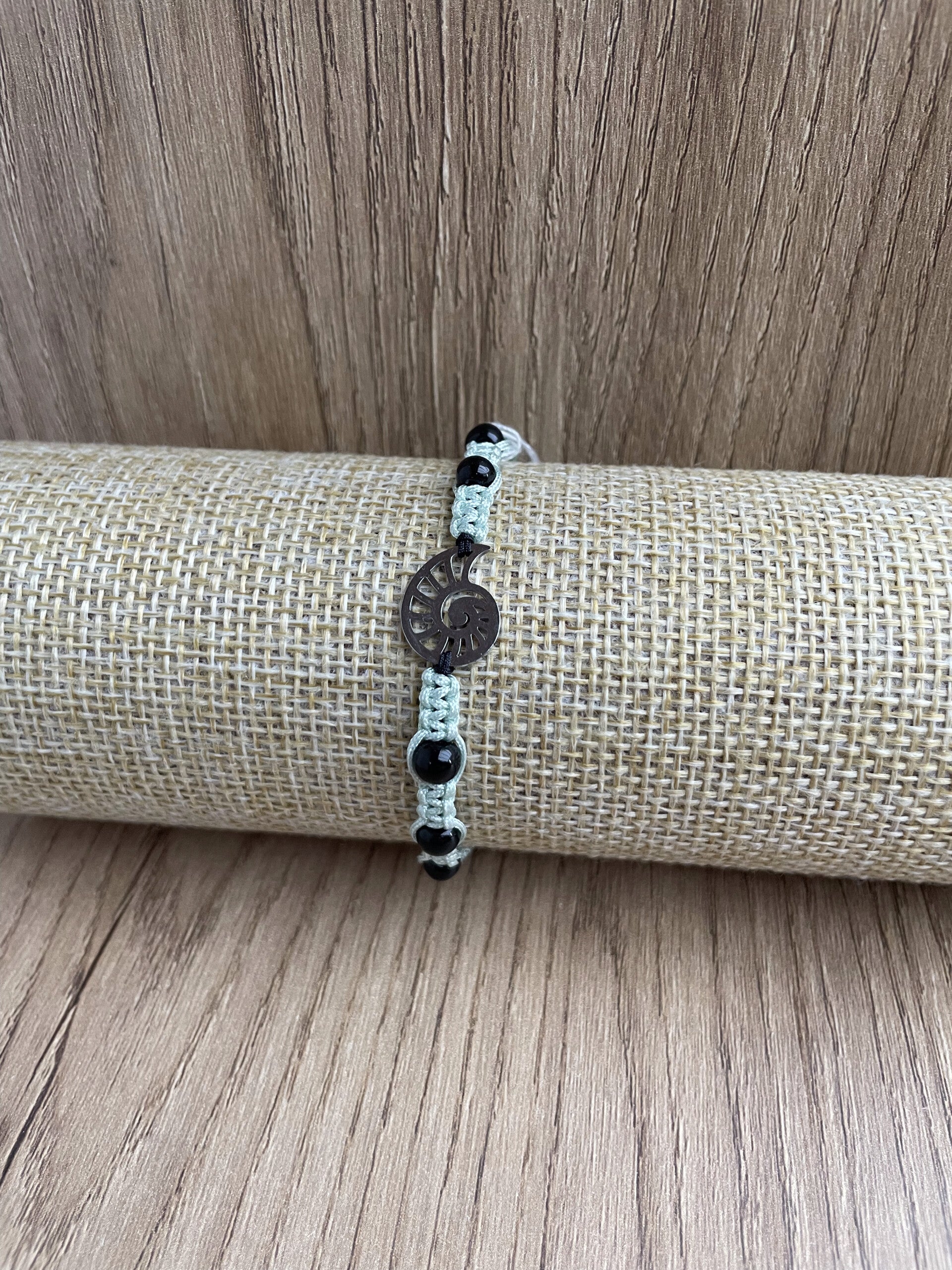Handgeknoopte armband met onyx en een schelpbedel (spiraal). Intuïtief samengesteld op kleur, gevoel en energie; een uniek, draagbaar ritueel dat je helpt om bij jezelf te blijven. De onyx voelt als een stevig anker, terwijl de schelpbedel je herinnert aan flow: stap voor stap, in jouw eigen ritme.