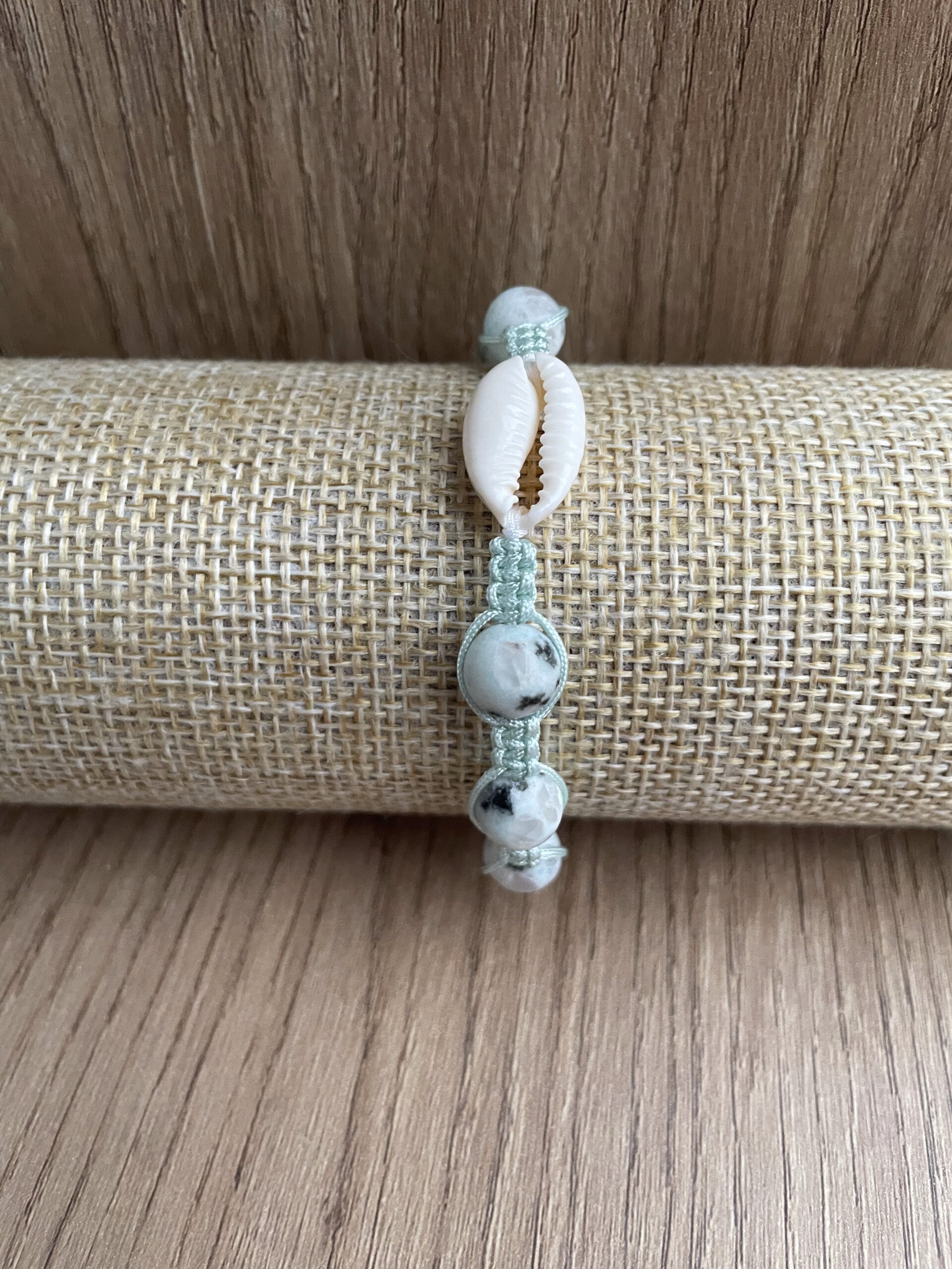 Handgeknoopte armband met maansteen en een kauri schelp. Intuïtief samengesteld op kleur, gevoel en energie; een uniek, draagbaar ritueel dat je herinnert aan zachtheid, intuïtie en meebewegen met jouw eigen ritme. De maansteen draagt een subtiele glow, terwijl de kauri een beschermend stukje zee-magie toevoegt.
